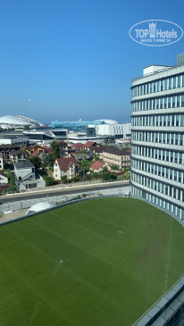 Коротко про отель. Разместили нас быстро, в главном холле отеля 5 лифтов, 3 для проживающих, 2 для персонала, лифты ходят медленно, что не очень комфортно, есть ещё лифт на подземную парковку, но им мы не пользовались. Номера средних размеров, минимальный набор мебели и посуды имеется. Сначала мне выделили номер 514, с видом на трассы и дорогу, но я быстро сориентировался и попросил номер во двор, так как там реально потише, за что отдельное спасибо администраторам на рецепшен! В номере есть холодильник, ТВ, большие панорамные окна, шторы достаточно хорошо затемняют свет, интернет нормальный, в ванной комнате кроме мыла не было ничего, так что пенно-мыльные принадлежности сюда надо брать по полной программе. От отеля до центра Адлера минут 10 ехать на такси, до пляжа, вроде ходит трансфер. магазинов рядом замечено не было. Отель рекомендую для командировочных, остальным, для отдыха, наверное лучше поискать отель у моря и променада. Всем хорошего отдыха!